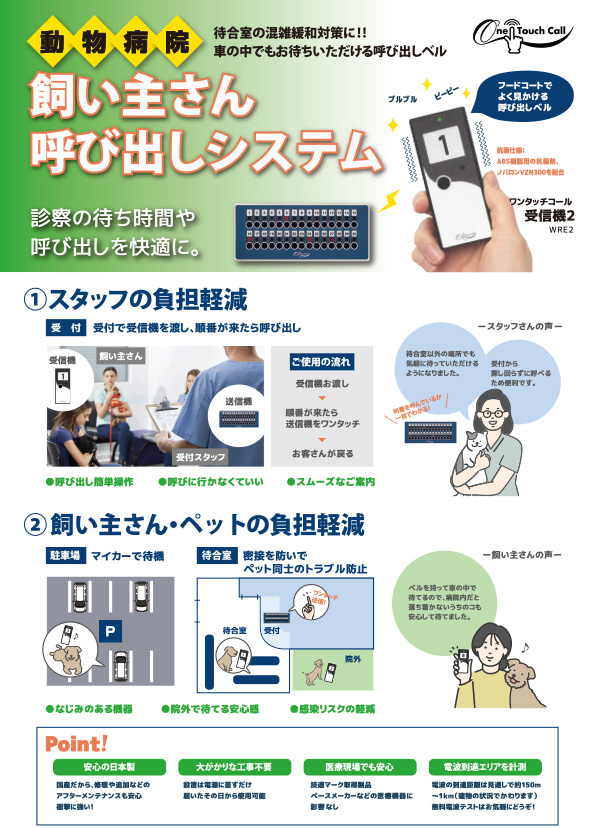 - 動物病院のペット同士のトラブル回避にも便利です。