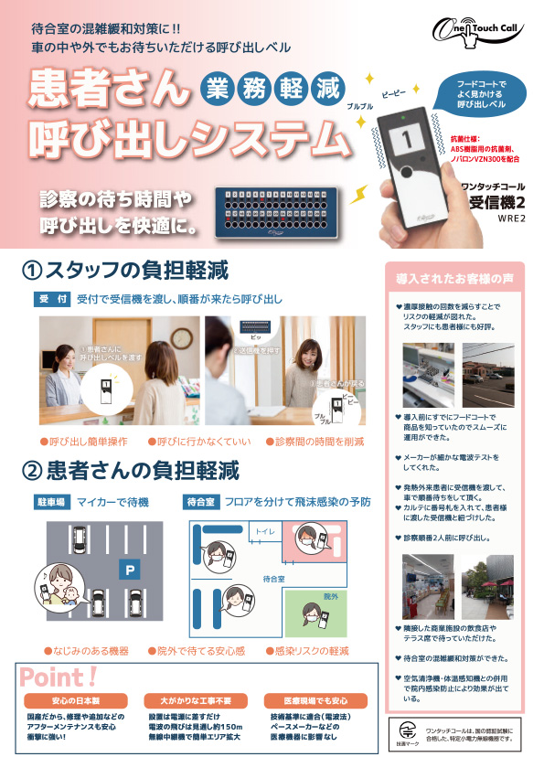 - 感染防止や、お子様の不安解消に。駐車場や院外で待てます。