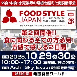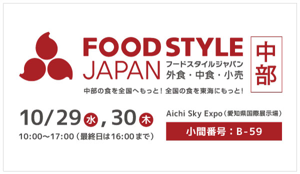 2025年10月29日(水)、10月30日(木)に「Aichi Sky Expo(愛知県国際展示場)」で開催される「FOOD STYLE JAPAN 2025 <中部>」 に今年も出展いたします。