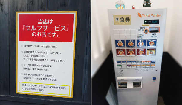 写真左:店頭の看板に『お店の利用方法』が書いてあるので初めての方も安心です。 写真右:お店に入ったらこの券売機で食券を買いましょう!