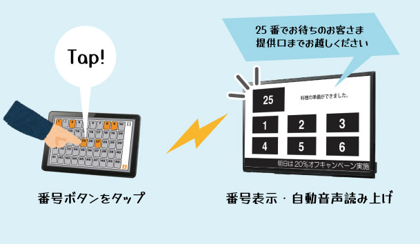 新たな運用では、料理が完成したら席番号を確認してタブレットでタップ。ディスプレイに番号を表示すると同時に自動音声で呼び出しをします。
