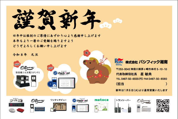 2026 新年のご挨拶 2026.01.06 お知らせ 新年 明けましておめでとうございます 皆様におかれましては輝かしい新年をお迎えのこととお喜び申し上げます 本年も より一層のご支援 お引立てを賜りますようお願い申し上げます 皆様のご健康とご多幸をお祈りし 新年のご挨拶とさせていただきます 2026年1月6日(火)より通常営業 出荷、お問い合わせも通常通り営業しておりますので よろしくお願い致します。